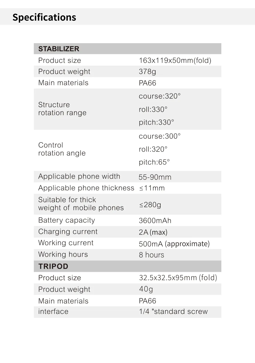 Specifications of TOKQI M01 3-Axis Anti-Shake Handheld Gimbal Phone Stabilizer Foldable Holder Selfie Tripod with Fill Light for iPhone Smartphone