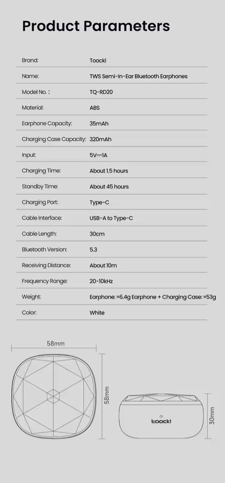 Toocki RD20 TWS Wirless Earphones Bluetooth 5.3 ENC Noise Cancelling 3D Stereo HiFi Sound Touch Control Support Separate ConnectCustomer Questions and answers :
