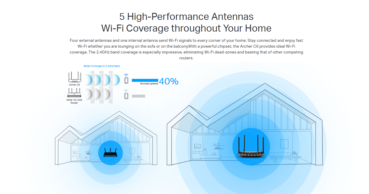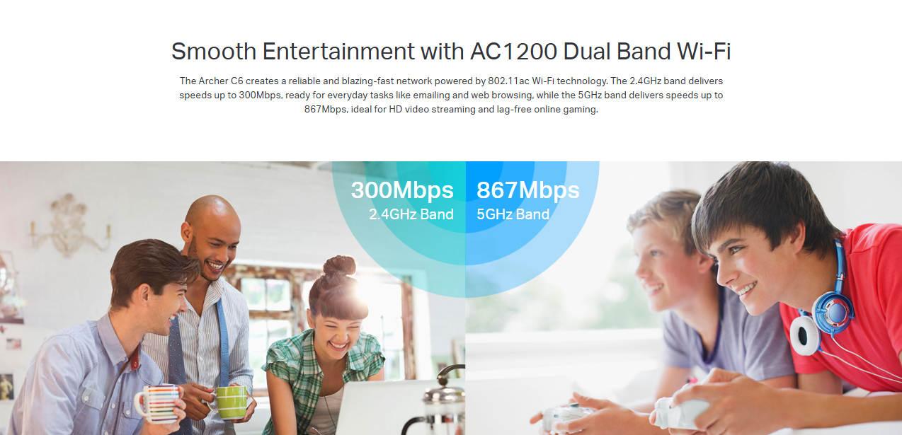 - Simultaneous 2.4GHz 300 Mbps and 5GHz 867 Mbps connections for 1200 Mbps of total available bandwidth