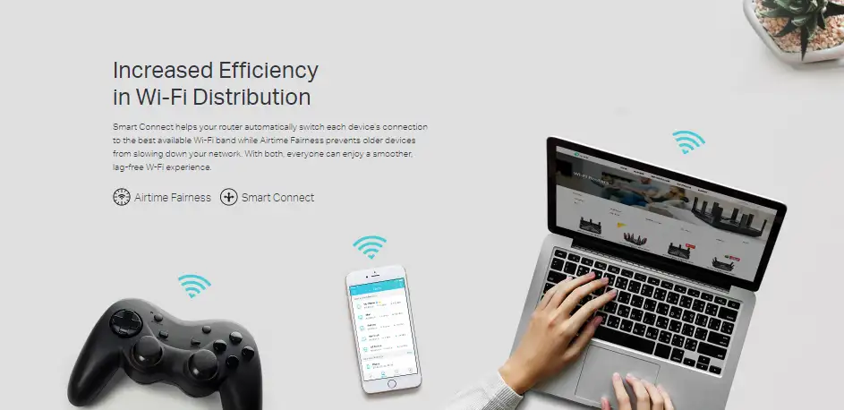 - Intelligent Connection – Smart Connect directs clients to the less congested band and Airtime Fairness optimizes the time usage.