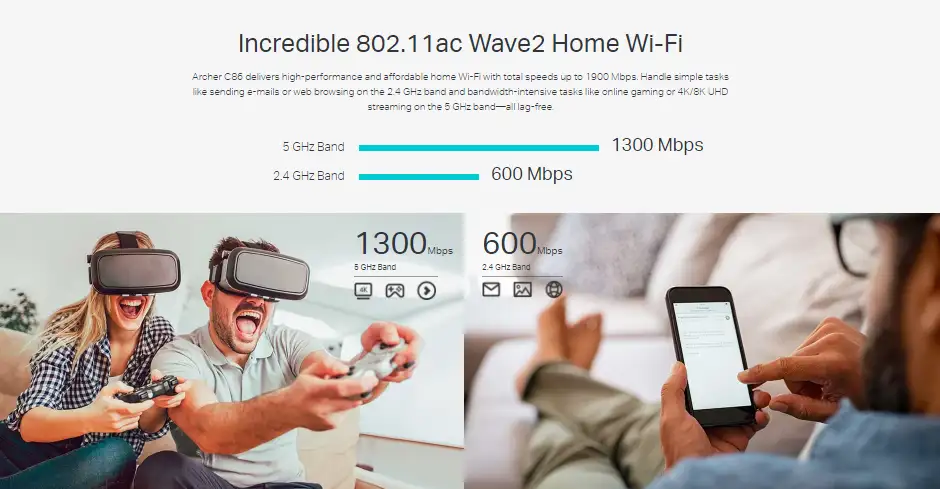- 802.11ac Wave2 Wi-Fi – 1300 Mbps on the 5 GHz band and 600 Mbps on the 2.4 GHz band.