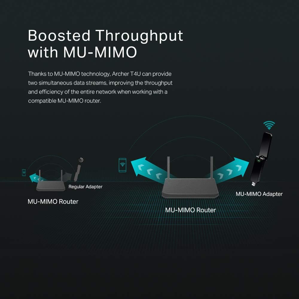 Thanks to MU-MIMO technology, Archer T4U can provide two simultaneous data streams, improving the throughput and efficiency of the entire network when working with a compatible MU-MIMO router.