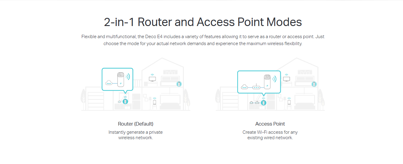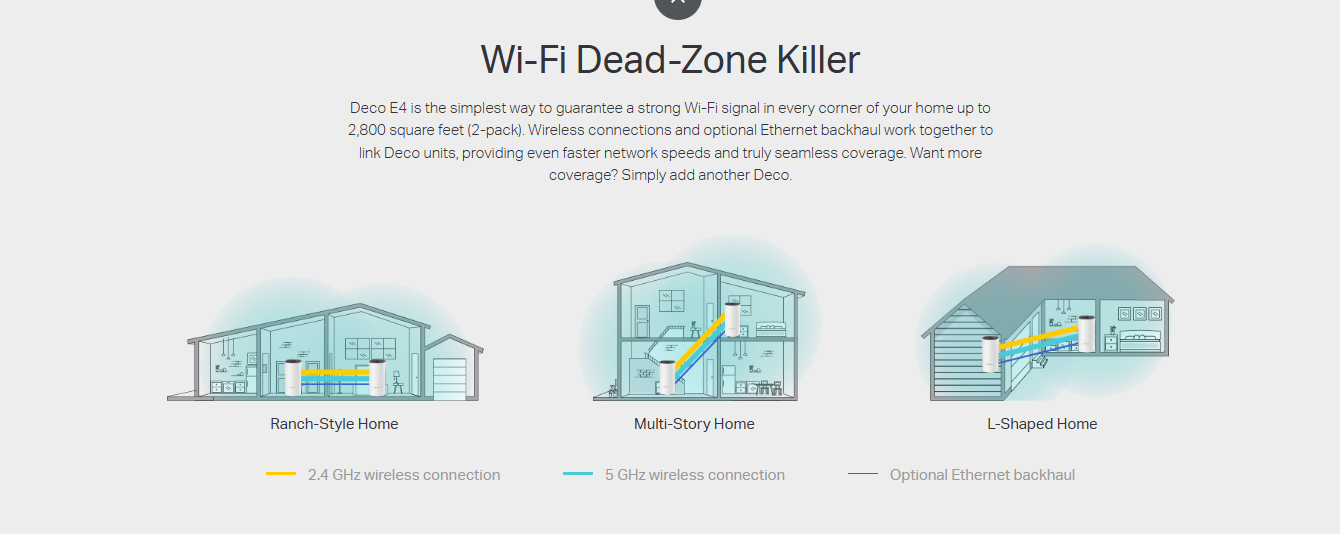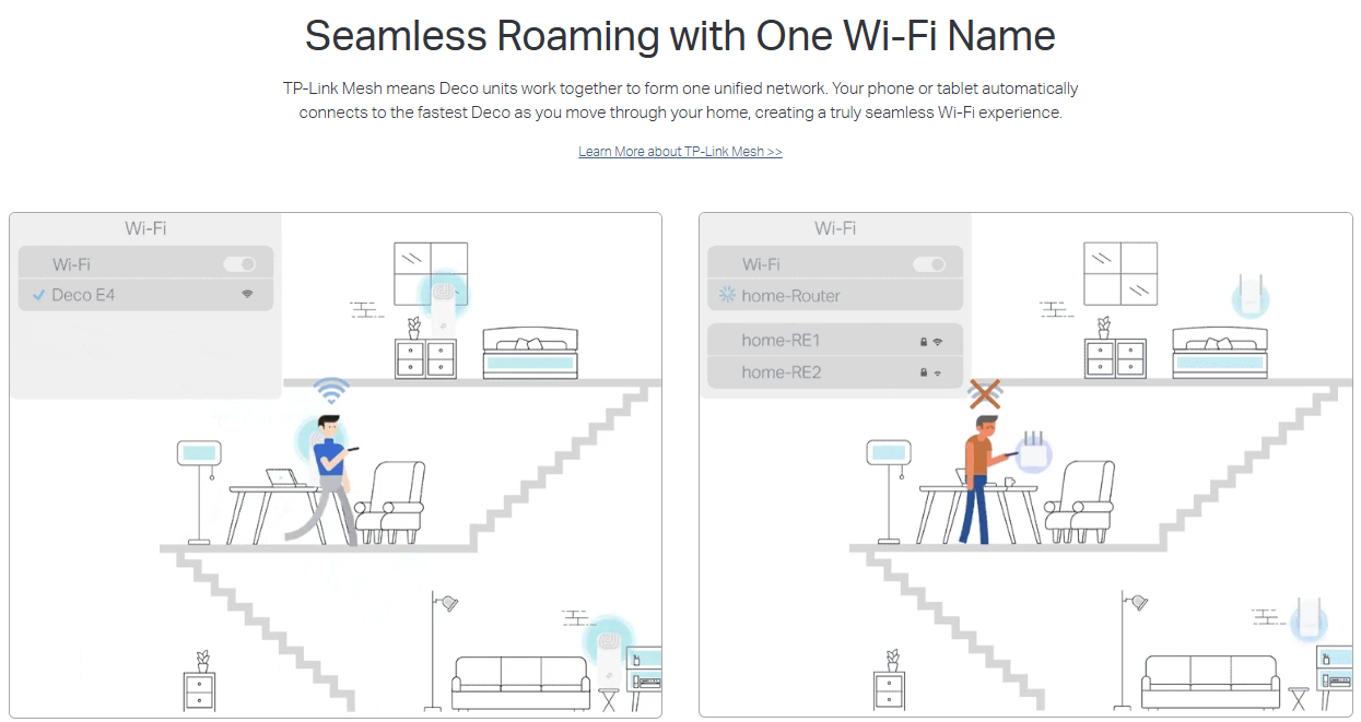 With advanced Deco Mesh Technology, units work together to form a unified network with a single network name. Devices automatically switch between Decos as you move through your home for the fastest possible speeds. - A Deco E4 two-pack delivers Wi-Fi to an area of up to 2,800 square feet (EU version). And if that’s not enough, simply add more Decos to the network anytime to increase coverage.
