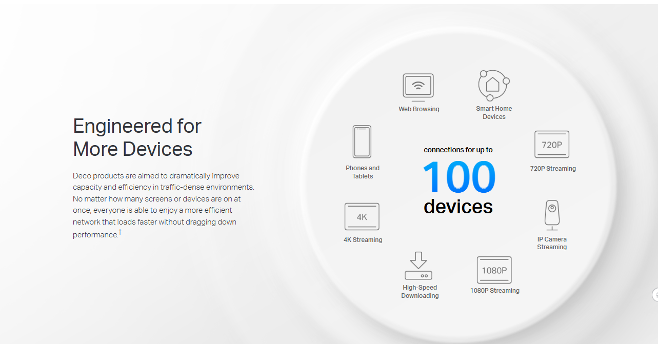 - Deco can handle traffic from even the busiest of networks, providing lag-free connections for up to 100 devices.