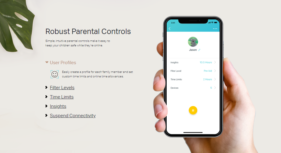 - Parental Controls limits online time and block inappropriate websites according to unique profiles created for each family member.