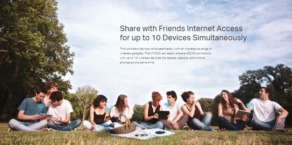 The M7000 supports the latest generation 4G FDD/TDD-LTE networks, providing convenient carry-on Wi-Fi in most countries and regions. Now you can enjoy lag-free HD video, fast file downloads, and stable video chats regardless of where life takes.
