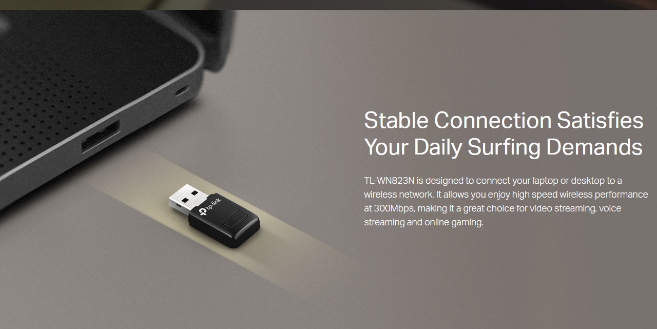 Stable Connection Satisfies Your Daily Surfing Demands: TL-WN823N is designed to connect your laptop or desktop to a wireless network. It allows you enjoy high speed wireless performance at 300Mbps, making it a great choice for video streaming, voice streaming and online gaming.