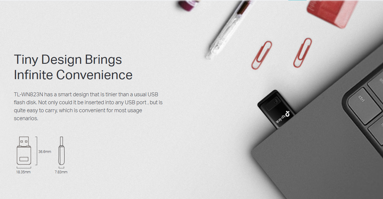 Tiny Design Brings Infinite Convenience:TL-WN823N has a smart design that is tinier than a usual USB flash disk. Not only could it be inserted into any USB port , but is quite easy to carry, which is convenient for most usage.