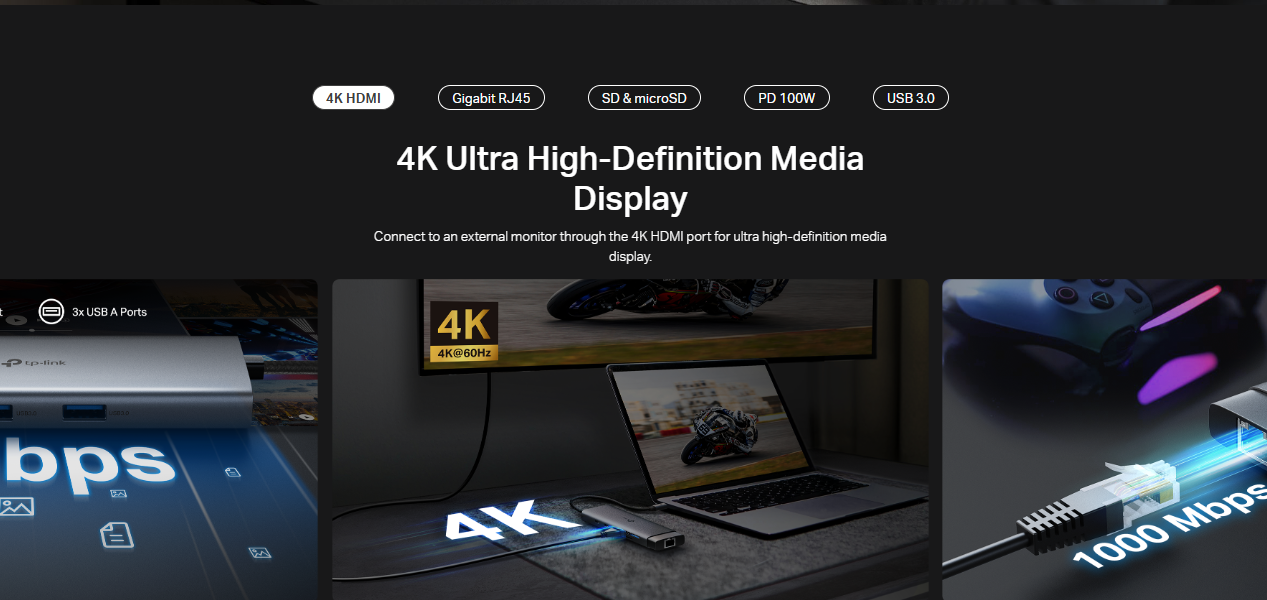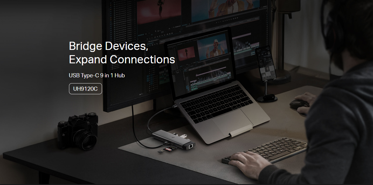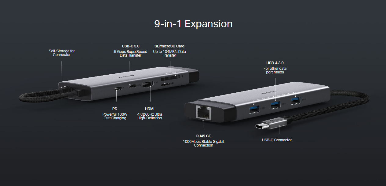 TP-Link UH9120C USB-C 9-in-1 Multi-Port Hub (4K@60Hz HDMI, Gigabit Ethernet, 100W PD Charging, USB-C Data, 3× USB-A 3.0, SD & MicroSD Card Readers)