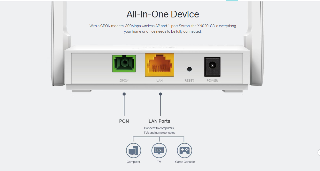 TP-Link XN020-G3 features 1 SC/APC port and 1 Gigabit LAN port for reliable wired connections. It supports IEEE 802.11b/g/n wireless standards and operates on the 2.4GHz frequency, delivering a signal rate of up to 300Mbps. Its external 5dBi antennas enhance wireless coverage and performance. The router complies with GPON standards, including ITU G.984 and ITU G.988, ensuring compatibility with modern internet technologies. It offers robust security features such as NAT Firewall, WPA/WPA2 encryptions, and MAC/URL filtering to protect your network. Additional software features include dynamic DNS, port forwarding, QoS for improved performance, and IPv6 support. The device’s compact design (115 x 106.7 x 24.3mm) ensures it fits seamlessly into any setup.