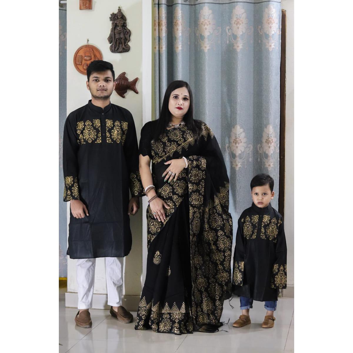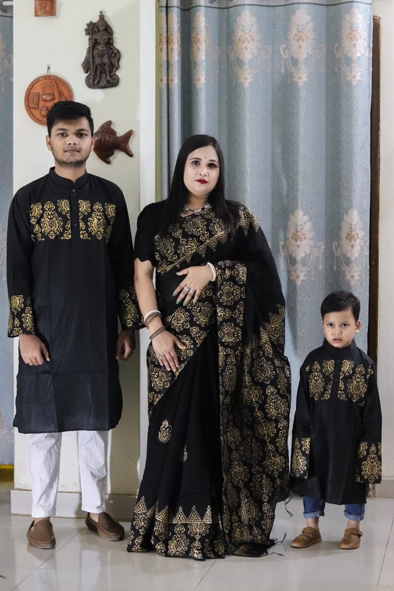 Trendsetter -Family Set Block Print Dhupian Silk Exclusive Couple Dress Deep Black Color Saree and Panjabi for Men women and Son- Inventive Choice - Black