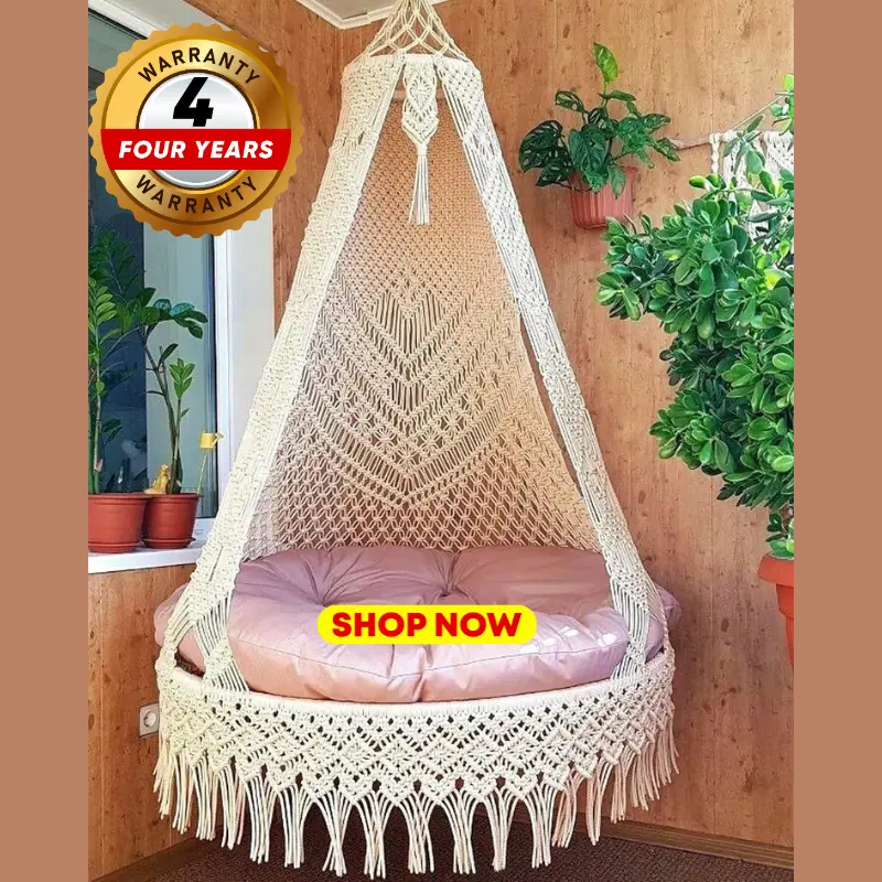 আপনার ঘর বা বারান্দার আভিজাত্য বাড়াতে নিয়ে এলাম প্রিমিয়াম কোয়ালিটির হাতে বোনা ম্যাক্রেম কটন সুইং দোলনা। বিকেলের অবসরে বই পড়া, প্রিয়জনের সাথে আড্ডা দেওয়া কিংবা একটু শান্তির ঘুমের জন্য এই দোলনাটি হবে আপনার সেরা সঙ্গী।