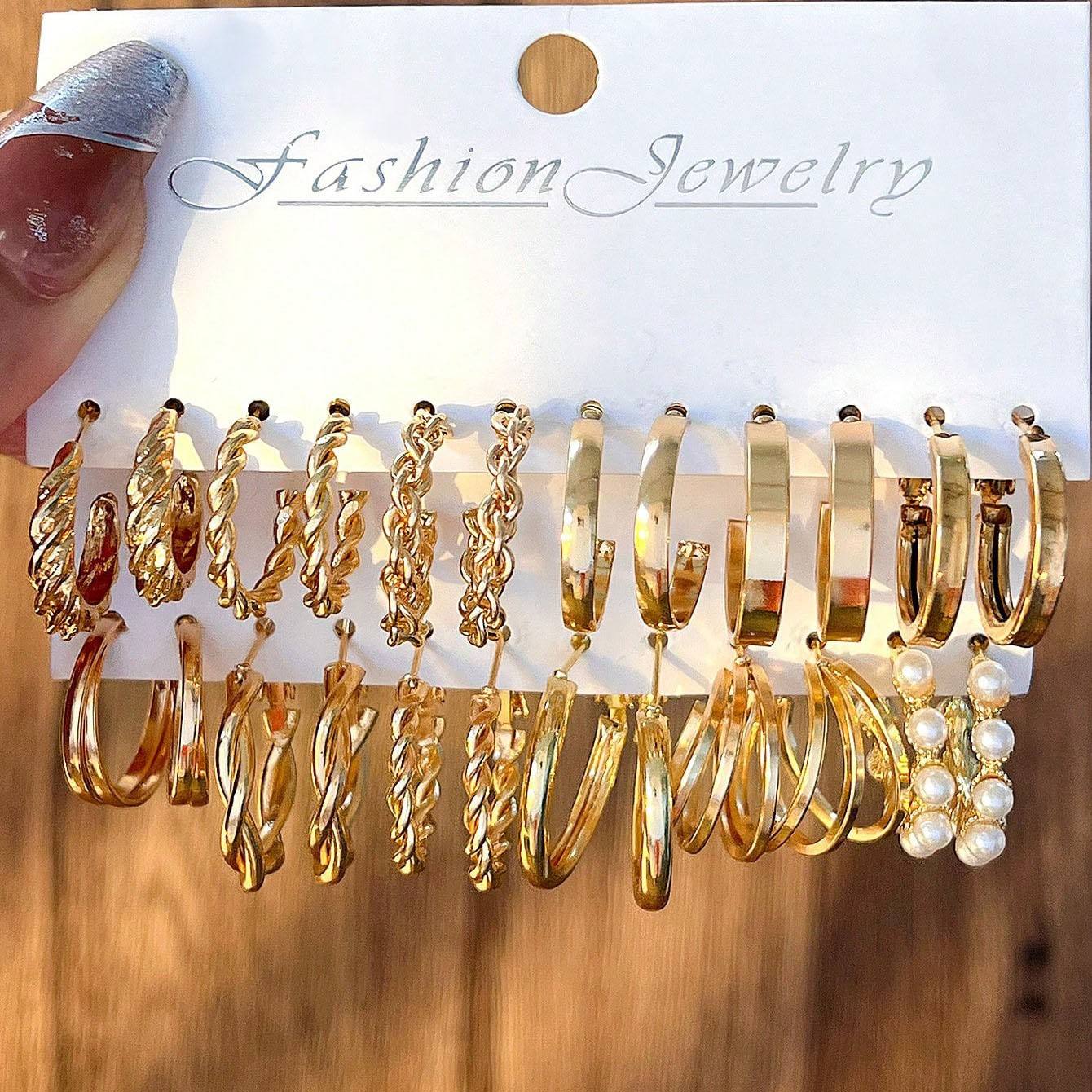 - Multi-piece set – Includes resin earrings, pearl studs, metal hoops, and geometric dangles.