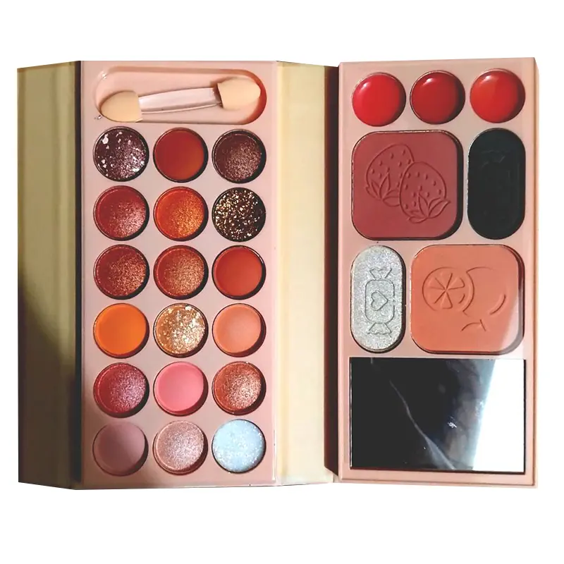 Comprehensive Makeup Collection: Eyeshadows, lipsticks, eyebrow powders, blushers, and highlighters.