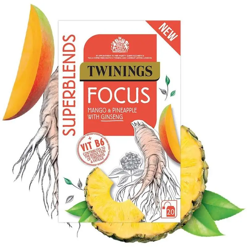 Mango and Pineapple Flavoured Herbal Infusion with Ginseng Root and added Vitamin B6. We all need help sometimes to see the wood for the trees. This is the inspiration behind the carefully crafted naturally caffeine free focus blend. A moreish flavour combination of sweet mango, tart pineapple and earthy ginseng root is perfect when you need a pick me up. +Vitamin B6 contributes to the reduction of tiredness and fatigue. Enjoy at least 1 cup a day as part of a varied and balanced diet and a healthy lifestyle. What does it taste like? Sweet with a subtle sharpness, you will want to drink this all day long. Part of our Superblends range - Our delicious range of benefit-led green teas and infusions, expertly blended with an added botanical, vitamin or mineral to support your everyday wellbeing.