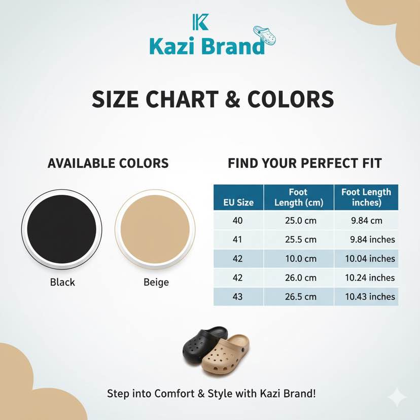 আমরা Kazi Brand থেকে নিয়ে এসেছি এই সিজনের সবচেয়ে ট্রেন্ডি EVA ক্লগস স্যান্ডেল – যা আপনার দৈনন্দিন জীবনে আরাম ও স্টাইল যোগ করবে। বৃষ্টি, রোদ, বা ঘরের ভেতর – সব জায়গায় এটি আপনার নিখুঁত সঙ্গী। পুরুষ ও মহিলা উভয়ের জন্যই ডিজাইন করা এই জুতোটি আপনার ফুটওয়্যার কালেকশনে থাকা আবশ্যক।