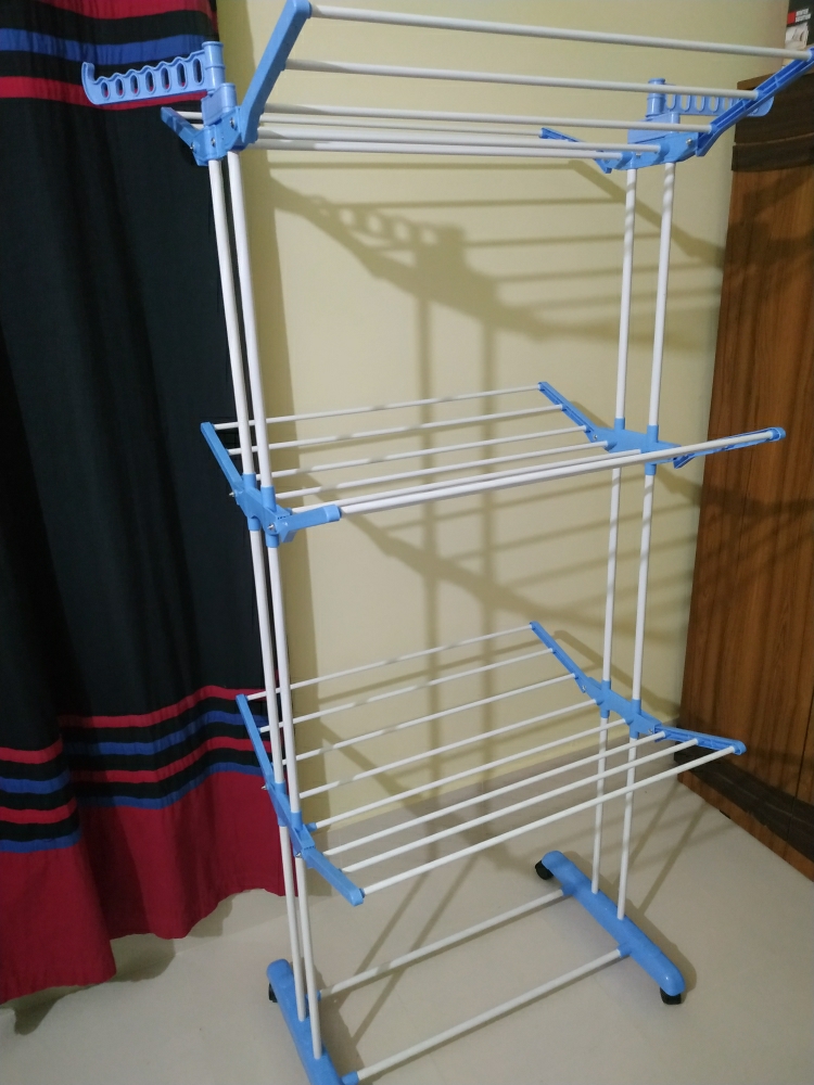 This deluxe 3 layers stainless steel clothes hanger will keep your clothes organised. It can be used as clothes dryer in outdoor or indoor to help cut the cost of tumble drying This multifunctional clothes rack will hold a large load of clothes with its strong stainless steel metal frame and two cross bars at the bottom to prevent it from swaying. Easily assembled, it’s ruggedly made from stainless steel and plastic and it can be folded for easy storage. Feature:: Portable multilayer stainless steel clothes rack Suitable for indoor and outdoor Multi purpose uses Strong stainless steel metal frame Foldable for easy storage Easy to assemble Excellent storage solution Specification:: Material: Stainless steel Measurement: 75-126 x 64 x 170 cm Weight: 6kgs Package:: 3 Layers stainless steel clothes rack Package size: 80 x 25 x 15 cm.