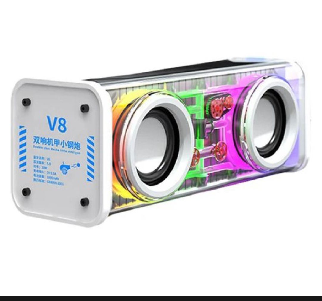 Enhance your audio experience with the V8 Transparent RGB Light Bluetooth Speaker. Featuring Bluetooth 5.0 connectivity, it delivers high-quality sound with vibrant RGB lighting effects. The portable design makes it easy to carry, while the built-in rechargeable battery ensures long-lasting playback. Perfect for parties, outdoor activities, or home use, this speaker combines style and performance.