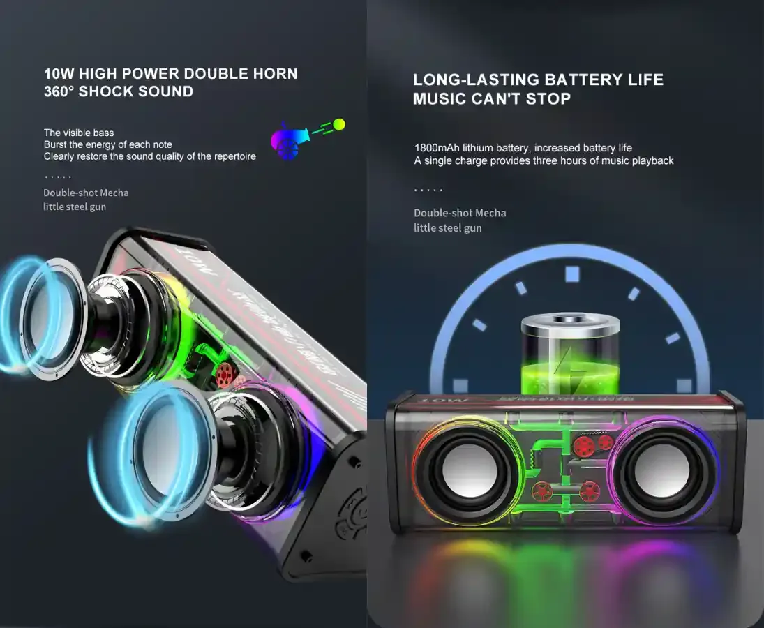 • 10W high-power dual speakers, 360° shocking sound effect
