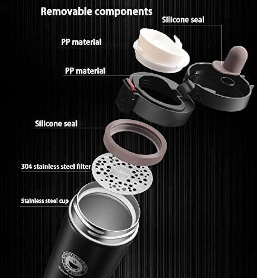 Crafted from *18/8 premium stainless steel, it’s durable, rust-resistant, and built to withstand everyday use. The **secure flip lid* features an easy one-hand push mechanism, preventing leaks while offering quick access to your drink. Inside, a *removable mesh strainer* lets you brew loose-leaf tea, prepare fruit-infused water, or enjoy smooth coffee on the go.