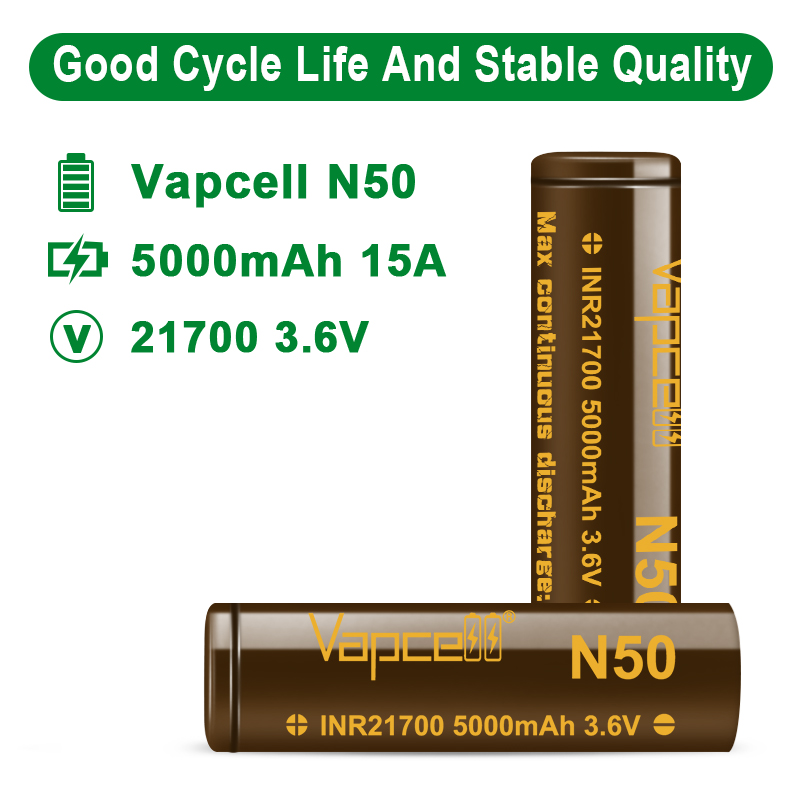 Vapcell 3.7V N50 21700 5000mah 15A Battery 2pcs