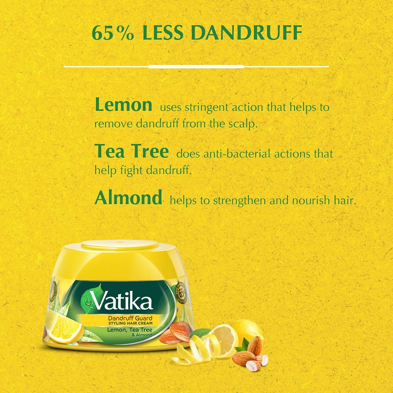 Vatika Dandruff Guard Hair Styling Cream helps you fight off dandruff & gives you Shine & Style all day. With the goodness of Almond, Lemon & Tea Tree oil. With Vatika Cream, Leave all your Dandruff worries Behind.