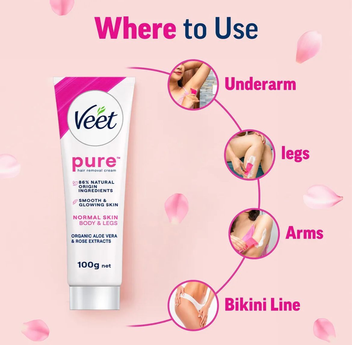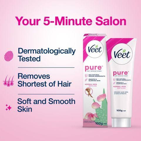 Veet Hair Removal Cream for Normal Skin is formulated with Lotus milk that gives salon-like silky smooth skin with 5 in 1 skin benefits: visibly brightens, moisturizes up to 24 hrs, exfoliates, smoothens & leaves pleasant Jasmine fragrance. Veet creams are available for normal sensitive & dry skin.