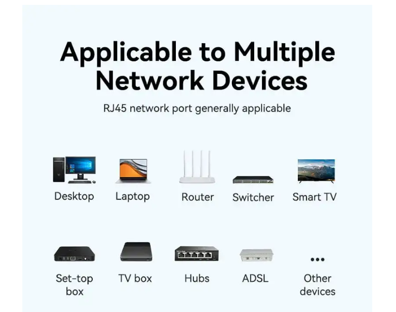 The plug comes with a tight connection point. This ensures the internal chip connects securely with the cable core, which improves network stability. With the custom back boot, you can cut and adjust it based on your cable’s thickness. It works with devices like Laptops, routers, TV boxes, Hubs, Smart TVs, etc.