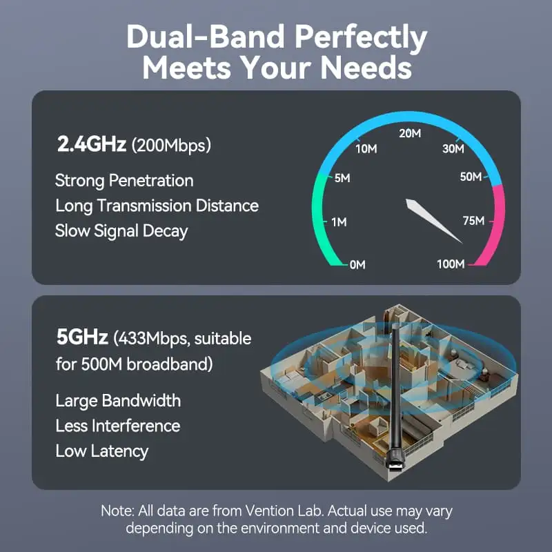The Vention KDTB0 provides data transfer rates of up to 650 Mbps. It operates on both 2.4GHz and 5GHz bands. So you can switch between better coverage and higher speeds depending on your needs.
