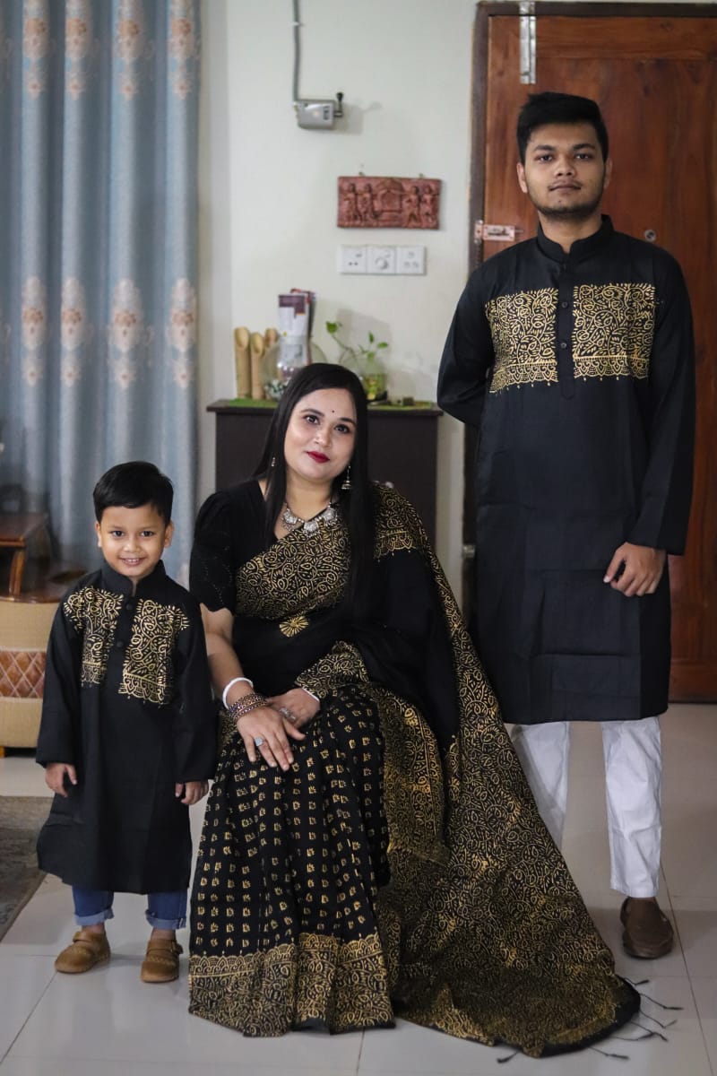 Versatile -Family Set Block Print Dhupian Silk Exclusive Couple Dress Deep Black Color Saree and Panjabi for Men women and Son- Avant-garde - Black