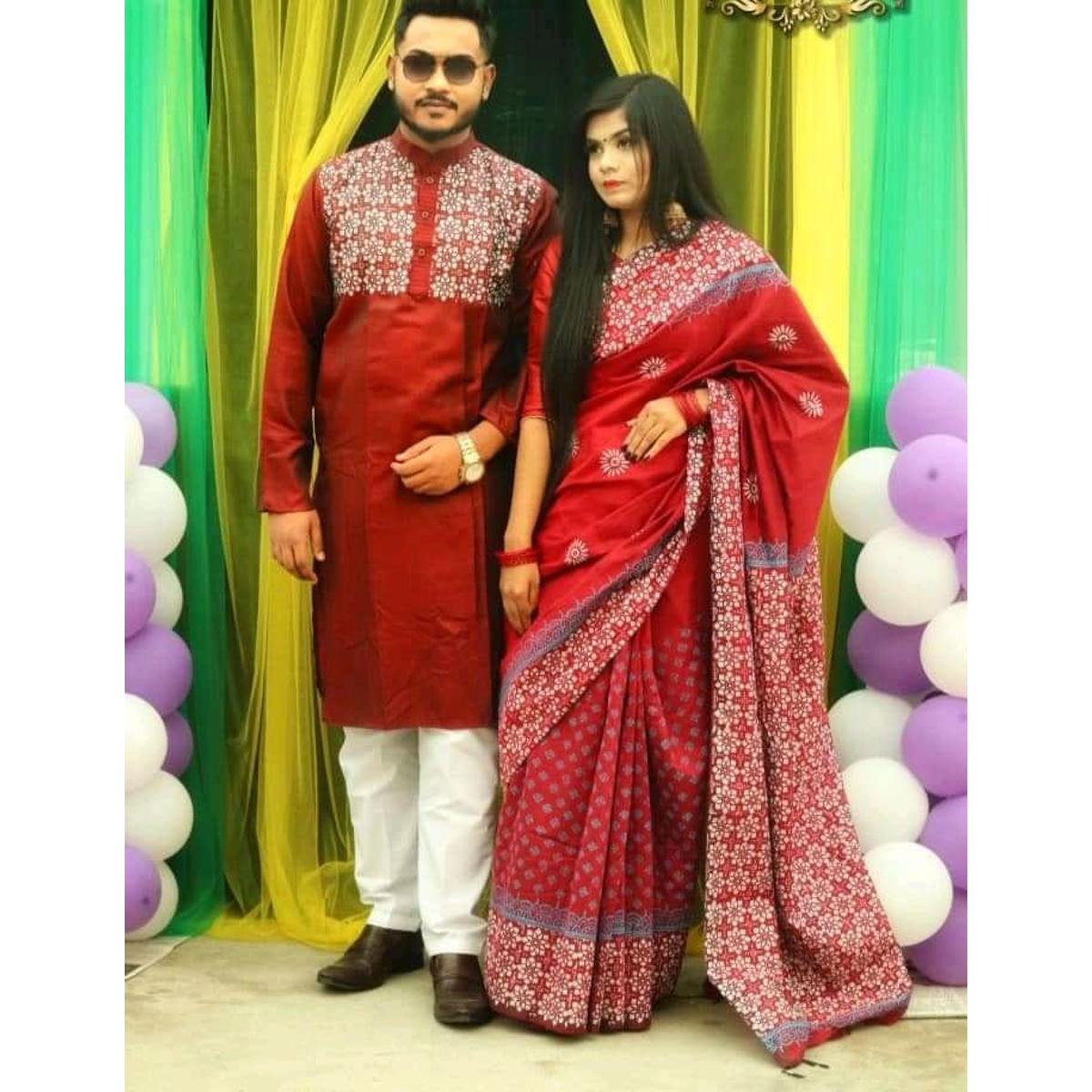 Versatile -Family Set Block Print Dhupian Silk Exclusive Couple Dress Maroon Color Saree and Panjabi for Men women and Son- Avant-garde - Maroon