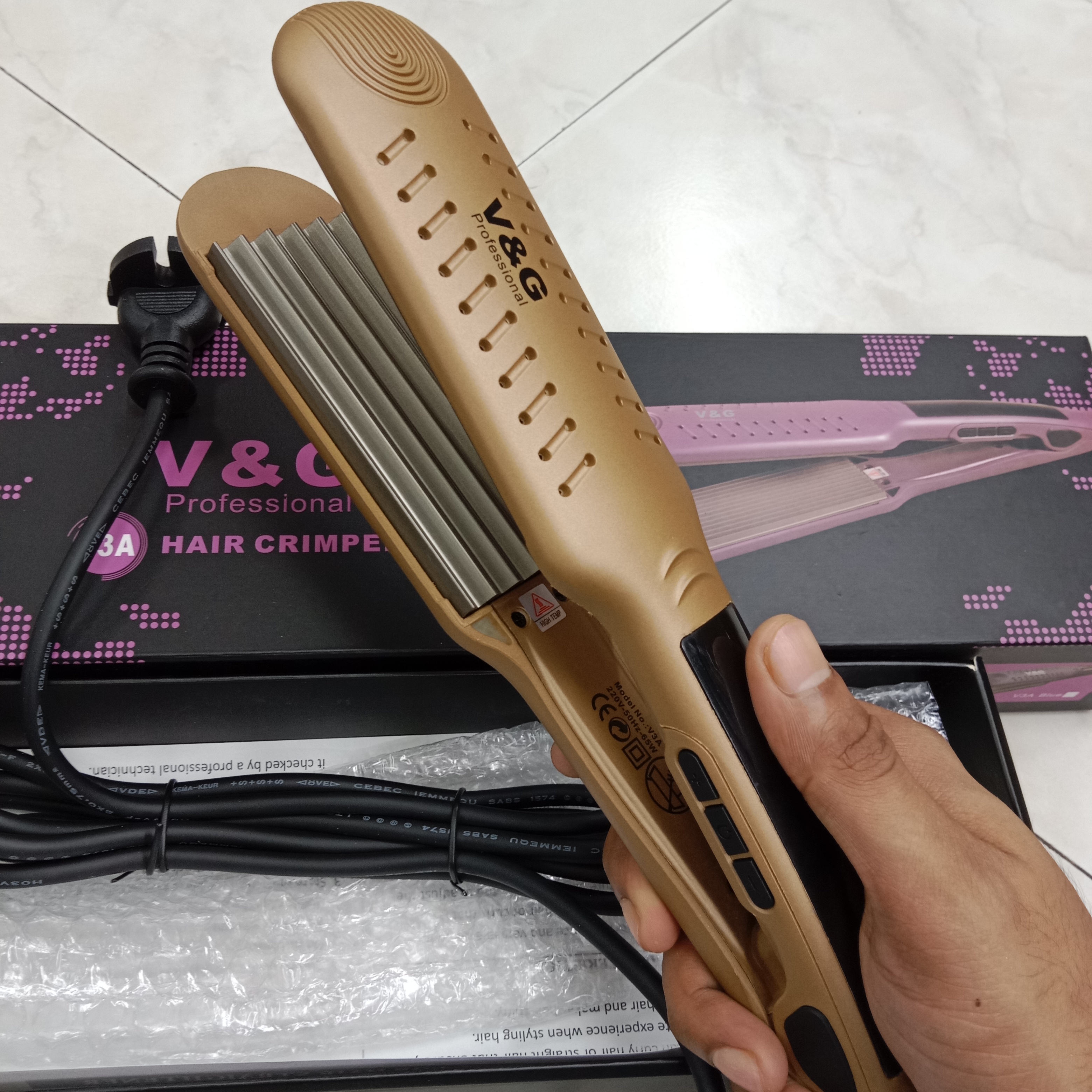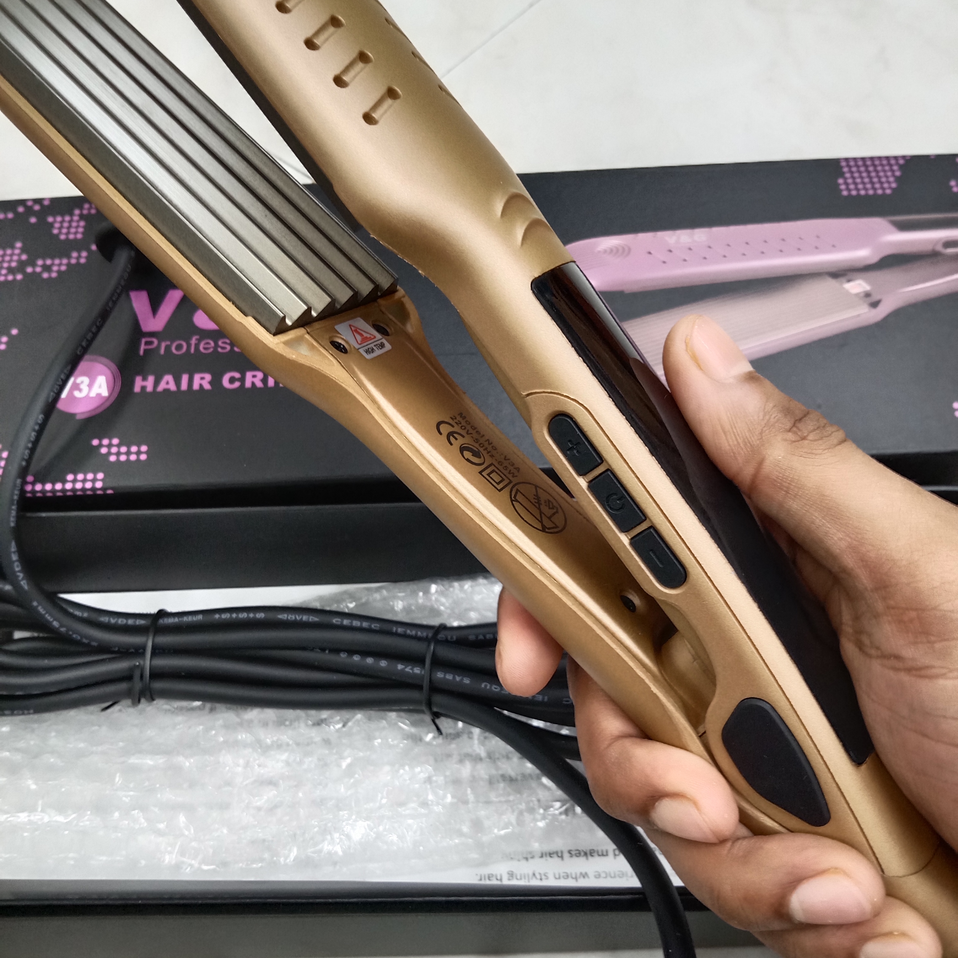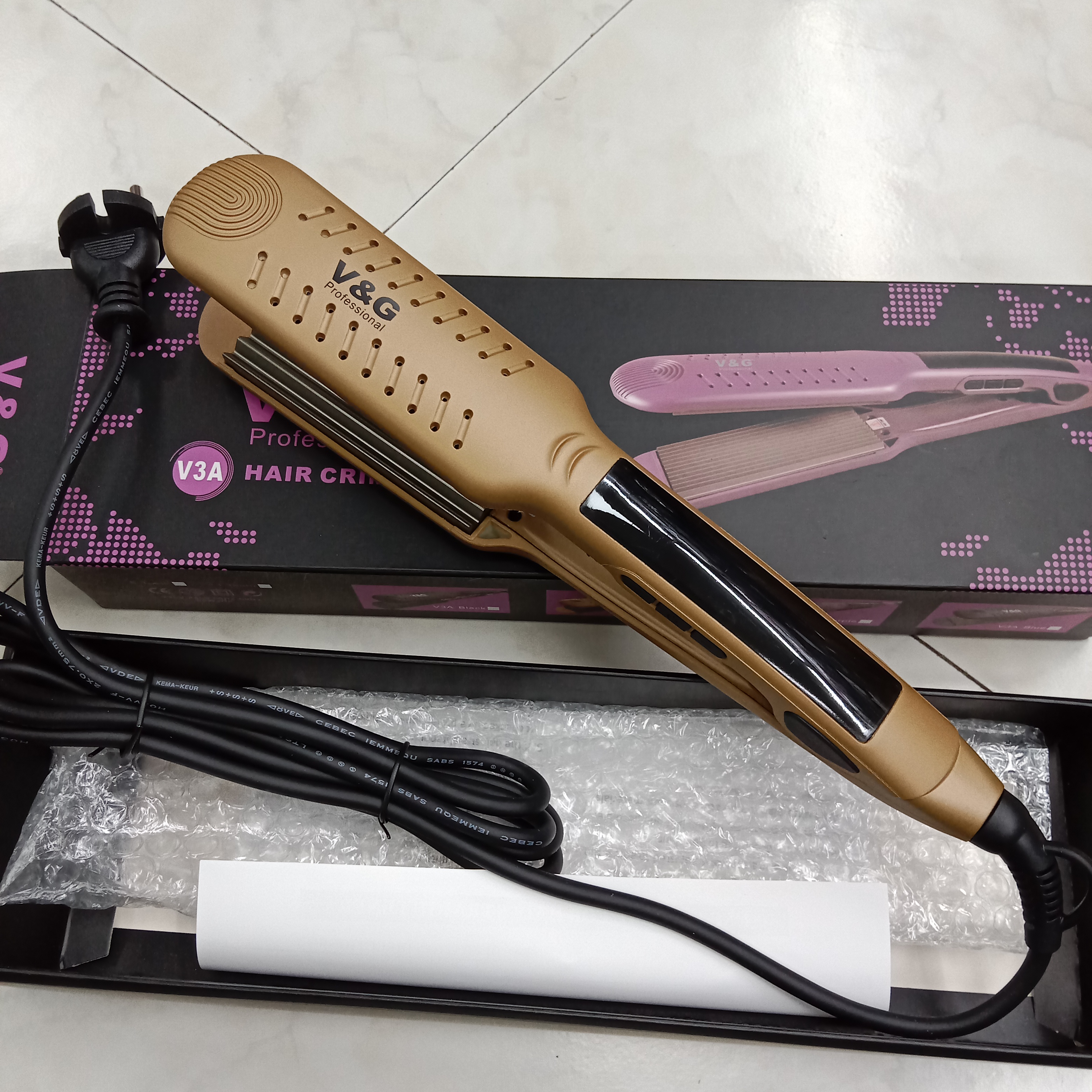 Unleash your creativity with the V&G Professional V3A Hair Crimper, the ultimate tool for achieving voluminous, textured styles with ease. Designed for professional-grade performance, this crimper features advanced ceramic plates that deliver consistent, gentle heat for long-lasting results. Perfect for adding volume, creating defined waves, or achieving unique crimped textures, the V3A ensures smooth operation and salon-quality results. With its rapid heat-up time and precise temperature control, the V&G Professional V3A Hair Crimper is your go-to tool for versatile and stunning hair styling.