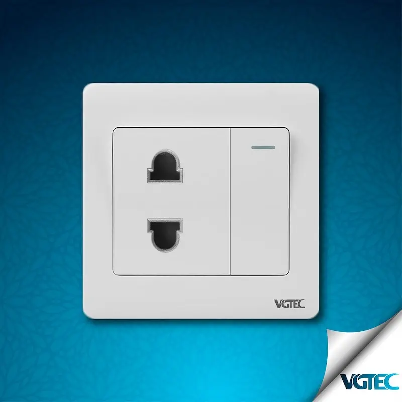 Product descriptions of 2 Pin socket with switch Series : Regular Brand : VGTEC Model : SORE 2P Color : White Rated Voltage: 250V Rated Current : 16A Panel Material: PC Frame : Metal Back Part : PC Touch Point : Silver Alloy Inner Parts : Copper Origin : PRC Warranty : 5 Years