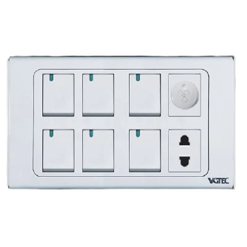 Product descriptions of 6 gang switch with fan Dimmer & 2 pin socket