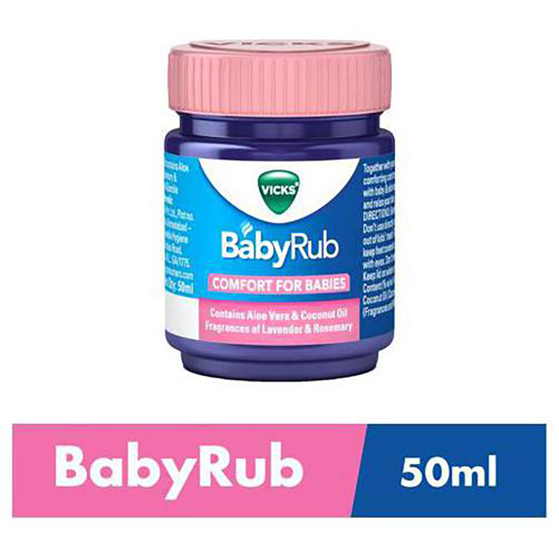 - NEW Vicks BabyRub – specially developed to gently moisturize soothe and relax your baby. It is made with Aloe Vera Coconut Oil and White Soft Paraffin known for their moisturizing benefits. It also contains fragrances of Lavender & Rosemary known for their calming and relaxing benefits.