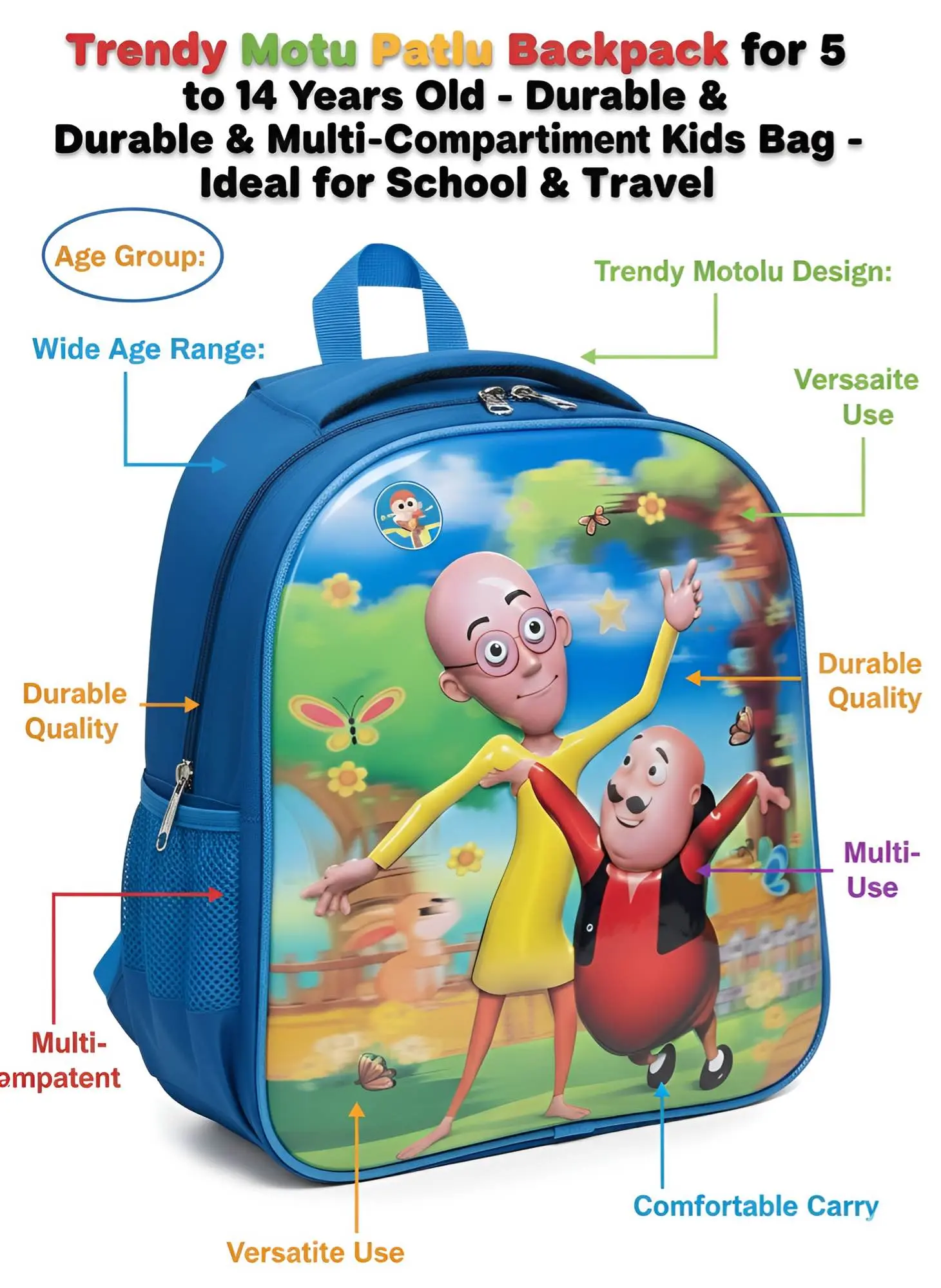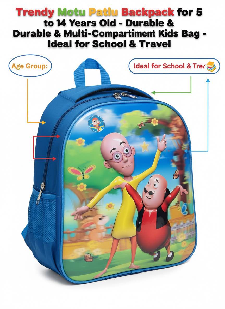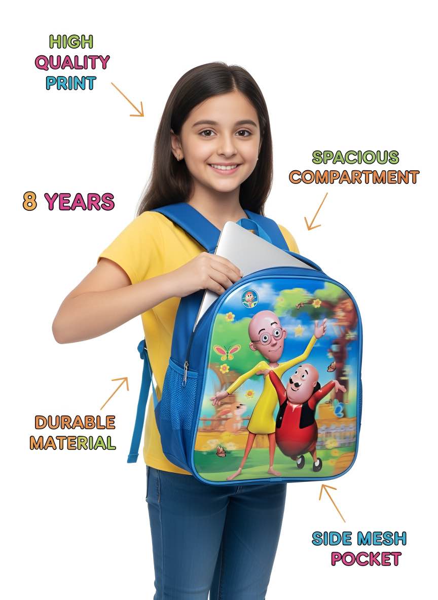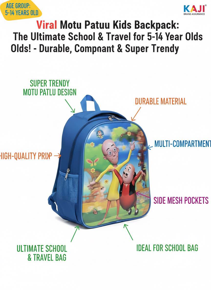 This KAZI BRAND Motu Patlu Kids Backpack is the perfect companion for 8-year-old boys and girls! Featuring a vibrant, high-quality print of their favorite characters, it's designed with premium, durable material for long-lasting use. The bag offers a spacious, multi-compartment interior, including a dedicated laptop slot, ensuring all essentials are organized. With comfortable, adjustable straps and convenient side mesh pockets, it’s ideal for school, travel, and everyday adventures. Give your child the joy of carrying their favorite Motu Patlu bag!