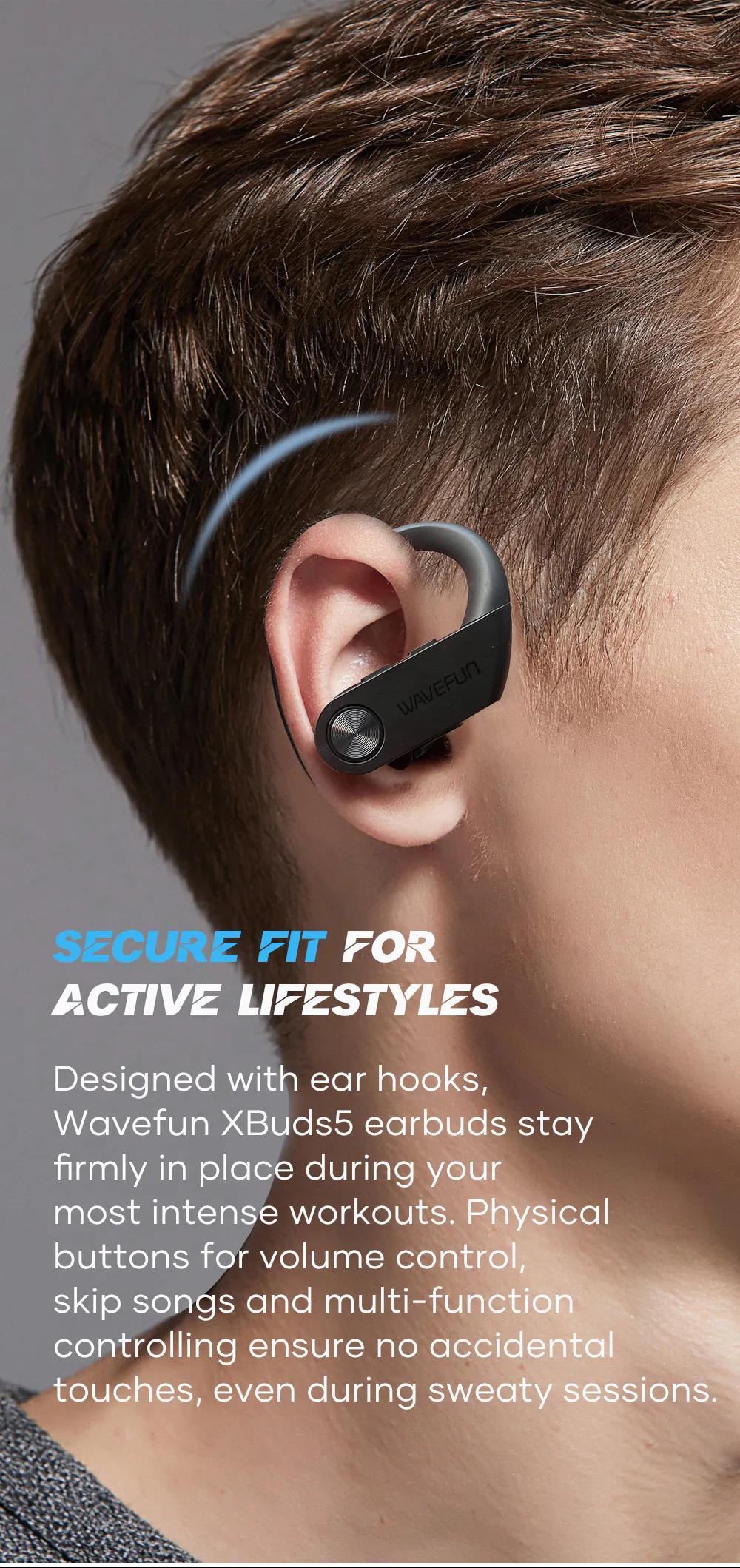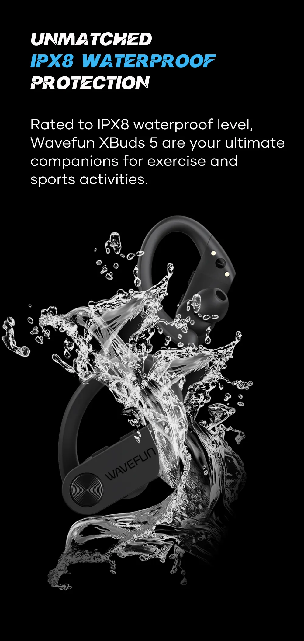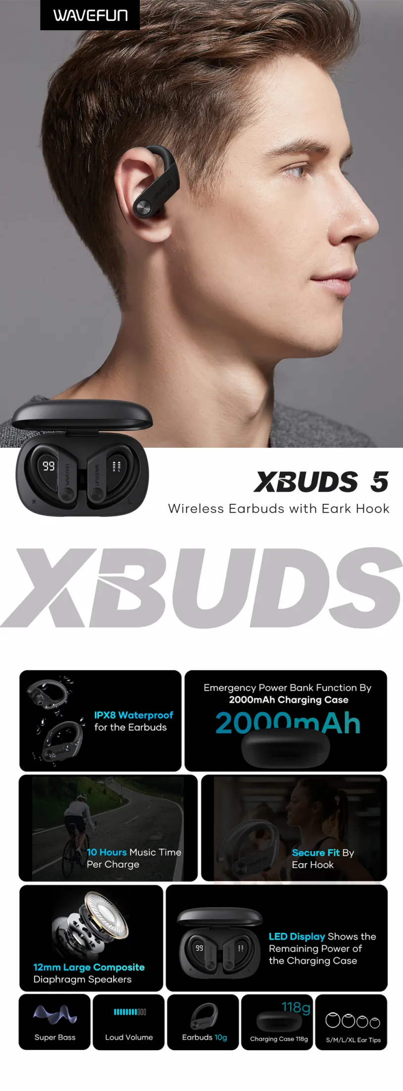 Wavefun XBuds 5 Wireless Earphone with Ear Hook IPX8 Waterproof 2000mAh Charging Case with Power Bank Function BT5.3 Workout Outdoor Headphones