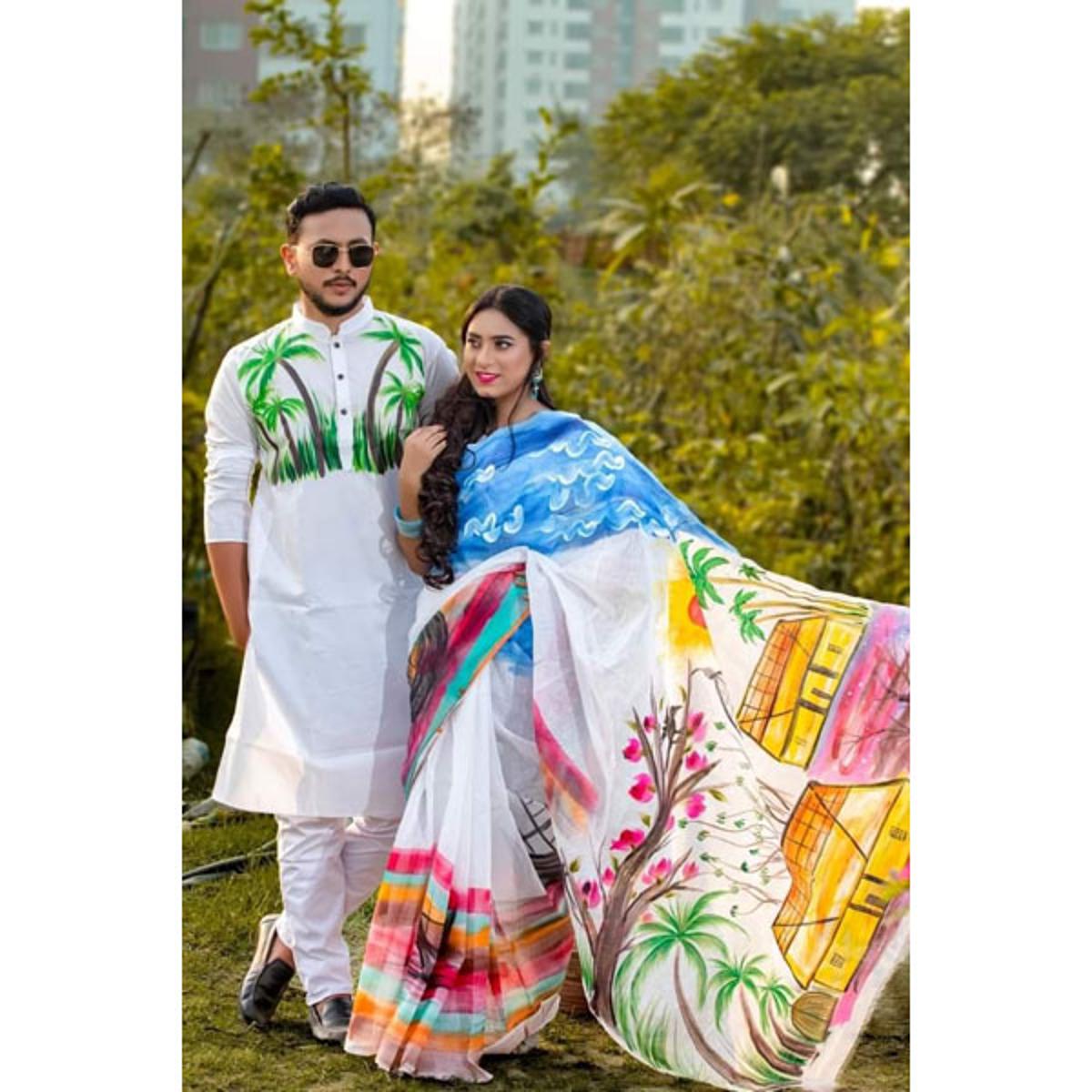 White Hand Print Half Silk Saree and Dupaiyan Panjabi couple Dress for Men and women