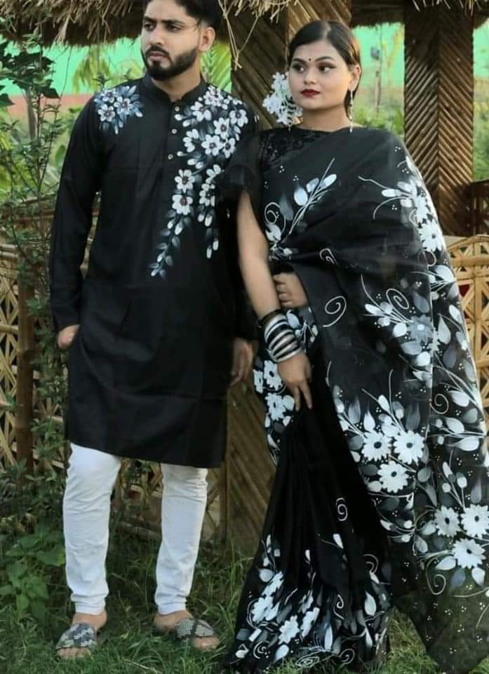 White Hand Print Half Silk Saree and Dupaiyan Panjabi couple Dress for Men and women