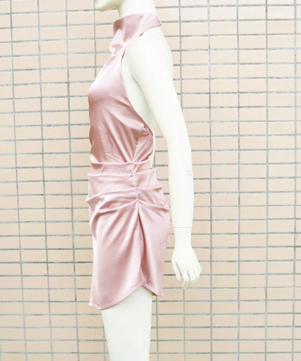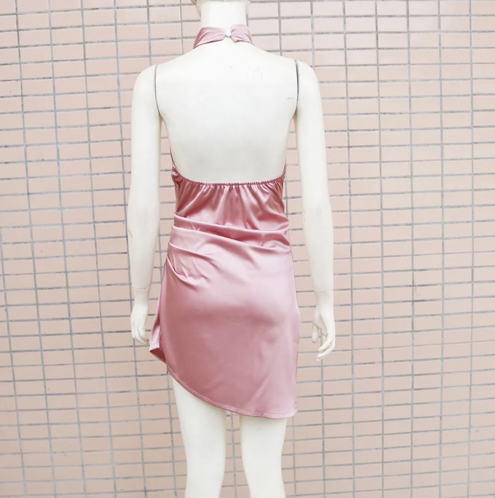 Women Satin Halter Neck Backless Sleeveless Irregular Mini Midi Dress 20262 All Season Se-xy Party Clubwear Dresses (Rose )