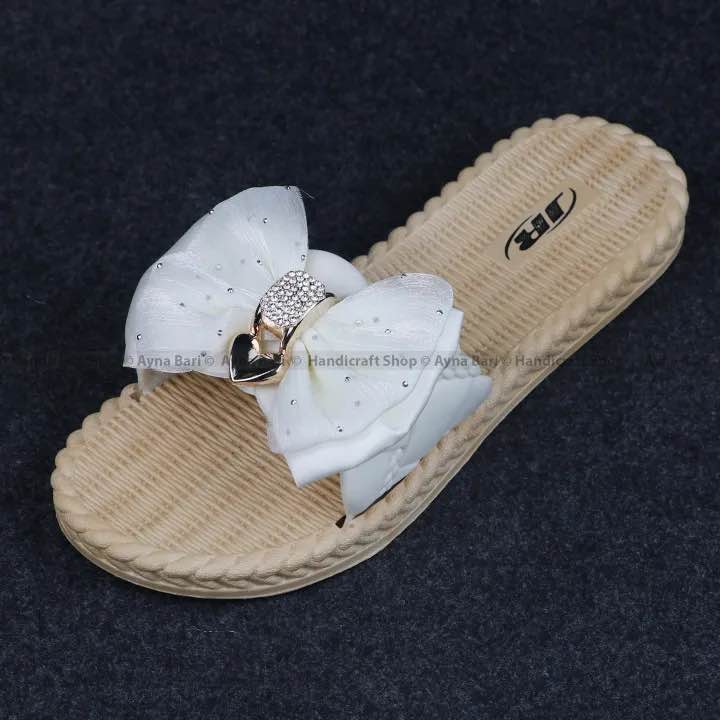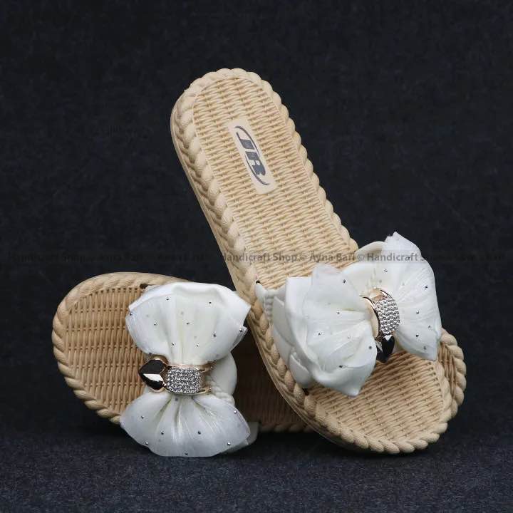 এই স্যান্ডেলগুলি সাধারণ স্লিপার নয়। এতে একটি বড়, নজরকাড়া বো (Bow) ডিজাইন রয়েছে, যা এর প্রধান আকর্ষণ। বো-এর ঠিক মাঝখানে যুক্ত করা হয়েছে ঝকঝকে ক্রিস্টাল/ডায়ামান্টে বাকল, যা এটিকে একটি প্রিমিয়াম ও গ্ল্যামারাস লুক দেয়।