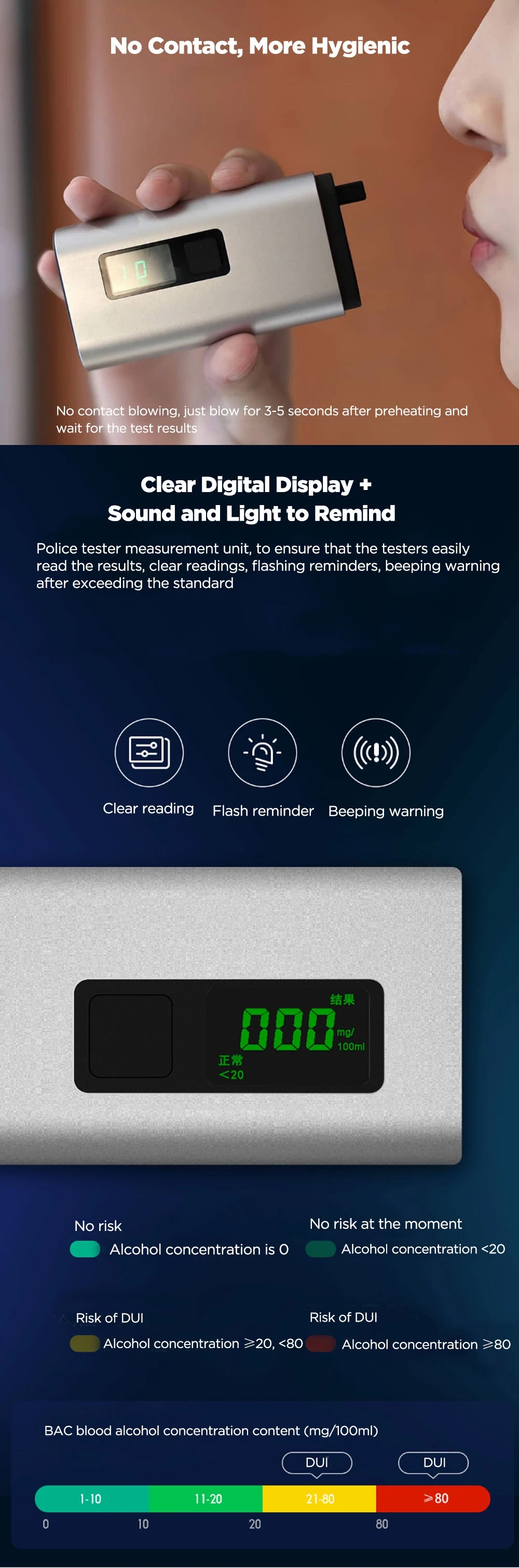 Accurate and fast alcohol testing, with its own operating guidelines, displaying results within 3 seconds after preheating, no contact, safe and hygienic.