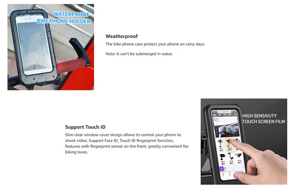 এই ফোন বন্ধনীটি স্বচ্ছ TPU (থার্মোপ্লাস্টিক পলিউরেথেনস) টাচ স্ক্রীনের সাথে আসে যা 90% এর বেশি সংবেদনশীলতা প্রদান করে, এটি সাইকেল চালানোর সময় সর্বাধিক সহজ ব্যবহার নিশ্চিত করবে।