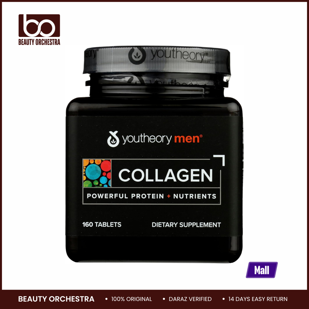 Youtheory® Collagen for Men (160-tablet bottle) is a targeted dietary supplement designed for men to help counteract age-related collagen loss. It’s enhanced with additional nutrients for overall skin, hair, joint, and protein support. The product is gluten-free, soy-free, and dairy-free.